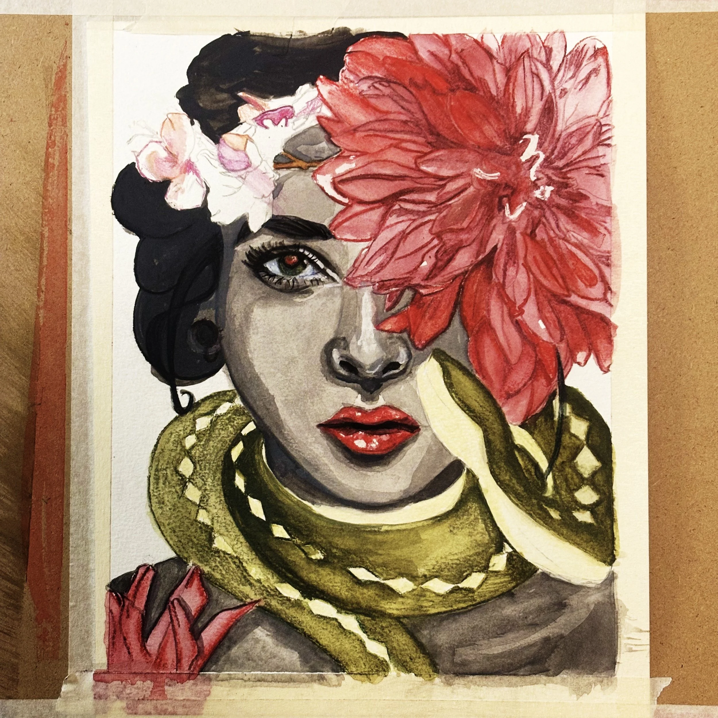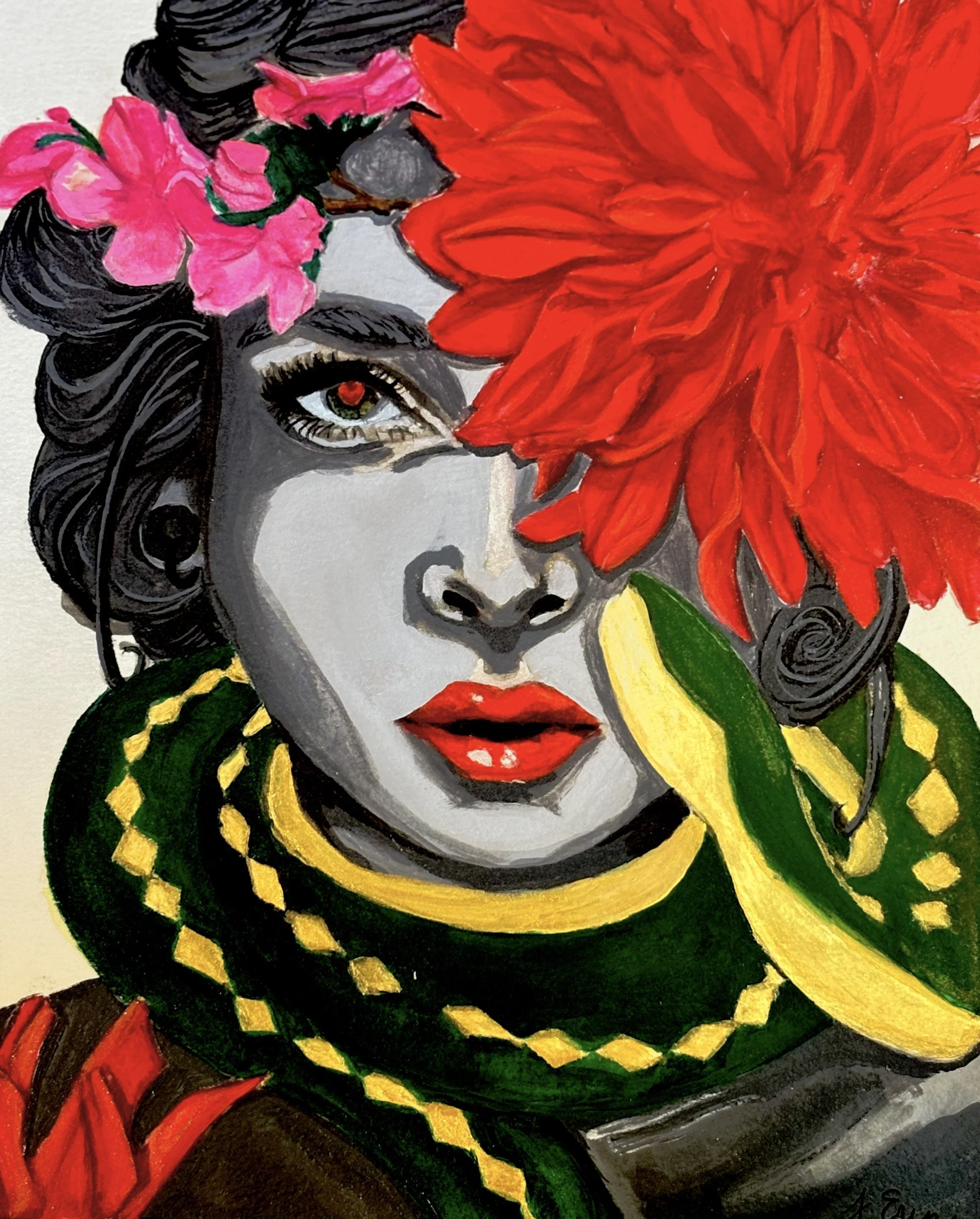 The Circle gauge earing in her ear. The circle symbolizes Unity, Infinity, and wholeness. The circle can also evoke feelings of completion, confidence, and safety. I hope you enjoyed the painting as much as I enjoyed making it.